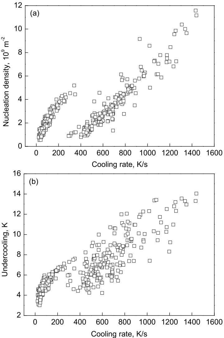- Fig.2 Relationships of nucleation density (a) and undercooling (b) with cooling rate