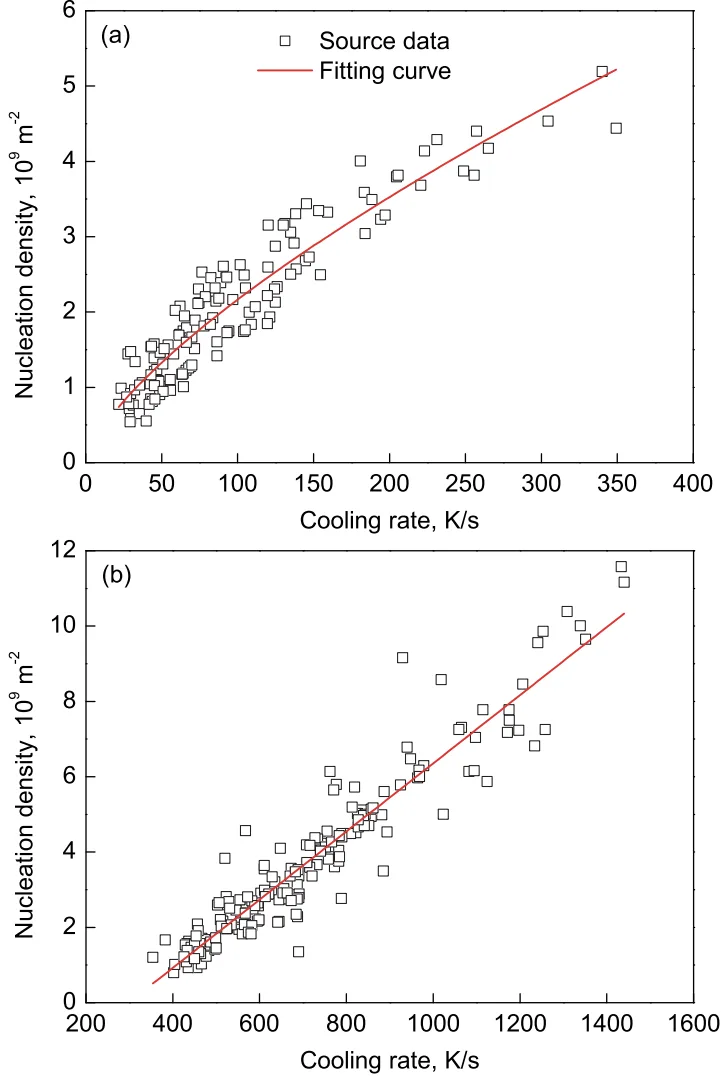 - Fig.3 Fitting between cooling rate with nucleation density at the lower cooling rate part (a) and the higher cooling rate part (b)