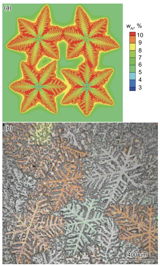 - Fig.4 Dendrite growth of magnesium alloy with different growth orientations (WAl—mass fraction of Al) (a) simulated result in a cooling rate of 10 K/s (b) OM photograph of casting of AZ91D with sand mould by using polarized light [15]