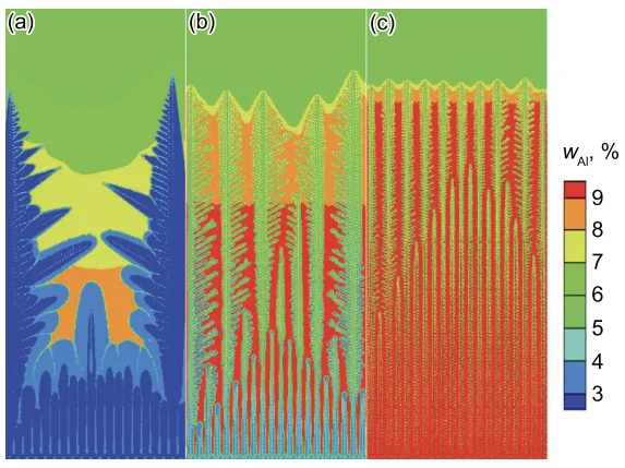 - Fig.5 Dendrite competition growth of magnesium alloy in direct solidification with different temperature gradients and solidification rates (a) GL=10 K/mm, V=2.5×10⁻⁵ m/s (b) GL=10 K/mm, V=2.5×10⁻⁴ m/s (c) GL=50 K/mm, V=2.5×10⁻⁴ m/s
