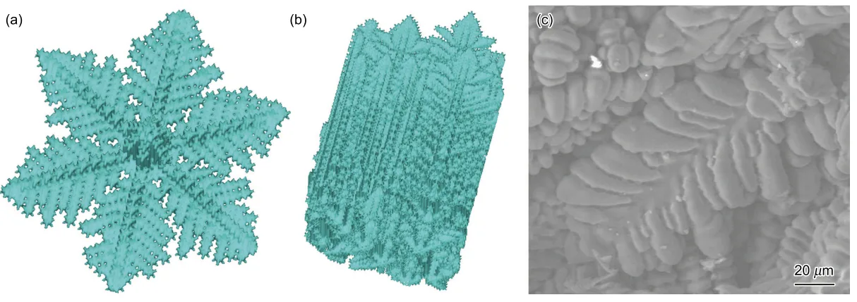 - Fig.6 3D simulated results and SEM image [15] of casting of magnesium alloy (a) simulated result of single crystal dendrite growth with a cooling rate of 10 K/s (b) simulated result of columnar dendrite growth with a temperature gradient of 10 K/mm and a cooling rate of 1 K/s (c) SEM image of casting of AZ91D with permanent mould [15]