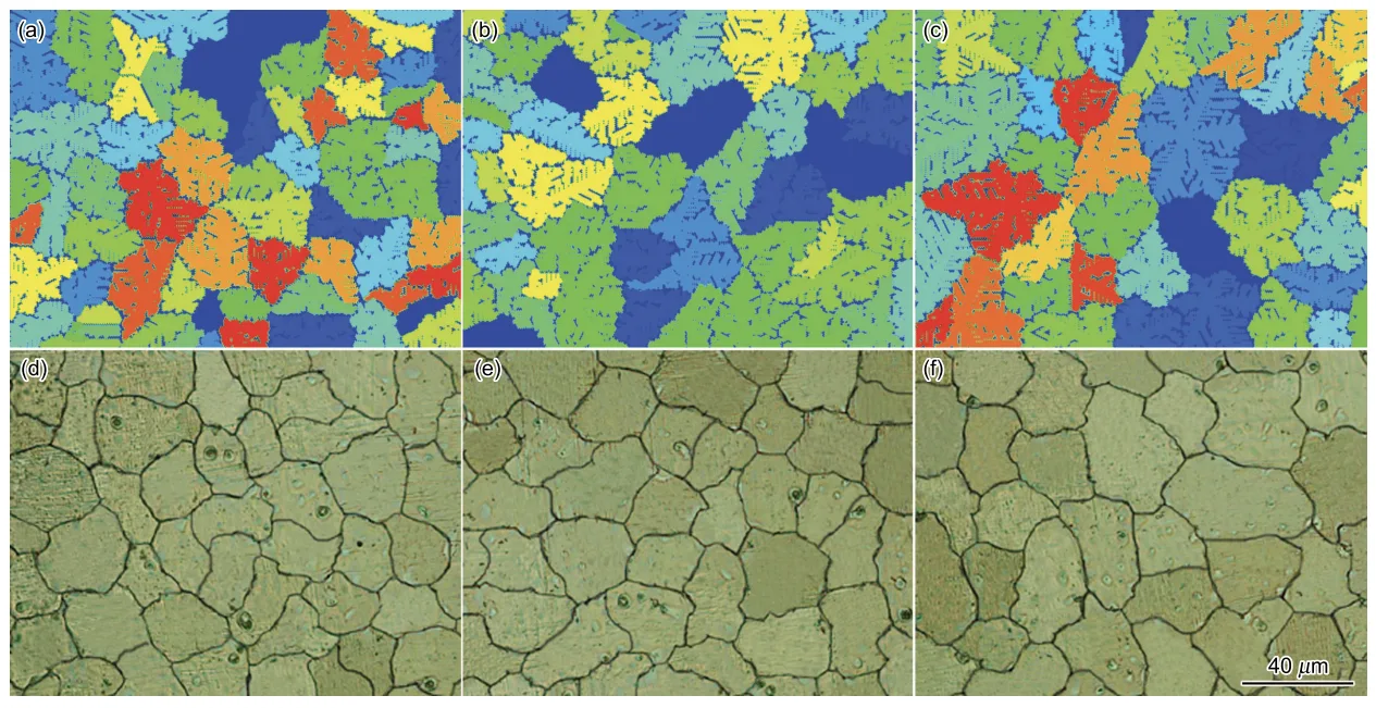 - Fig.8 Comparison between simulated results (a—c) and metallographs (d—f) of the “step shape” castings (located at center of the Step 4 in Fig.7) of magnesium alloy AM50 with different pouring temperatures of 933 K (a, d), 953 K (b, e) and 983 K (c, f)