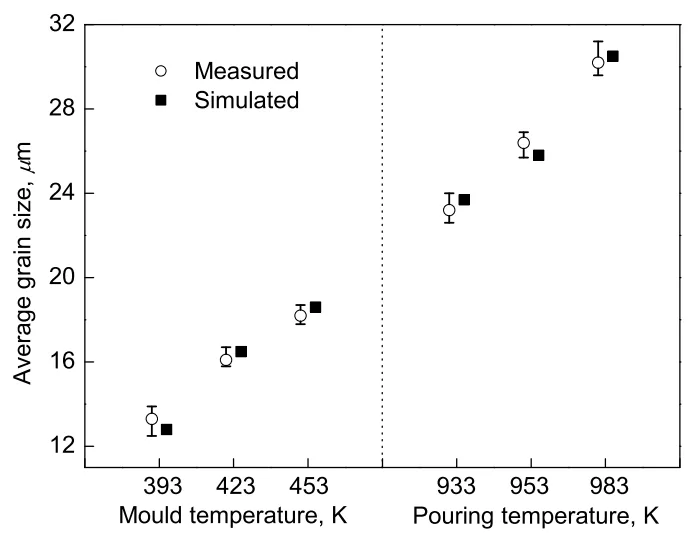 - Fig.10 Comparison between measured and simulated average grain size of the “step shape” casting of magnesium alloy AM50 with different mould preheating temperatures (located at surface of Step 2 in Fig.7) and pouring temperatures (located at center of Step 4 in Fig.7)
