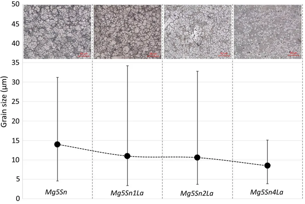 - 結晶粒微細化: ランタン(La)はMg-Sn合金において結晶粒微細化剤として作用し、La含有量の増加とともに結晶粒径が減少します(図2)。4% La合金(Mg5Sn4La)は、最も微細な結晶粒組織と最も均質な結晶粒径分布を示しました。