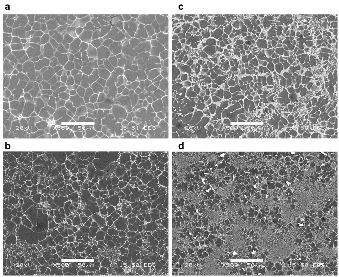 - Fig. 3 調査した合金のSEM像。a Mg5Sn、b Mg5Sn1La、c Mg5Sn2La、d Mg5Sn4La