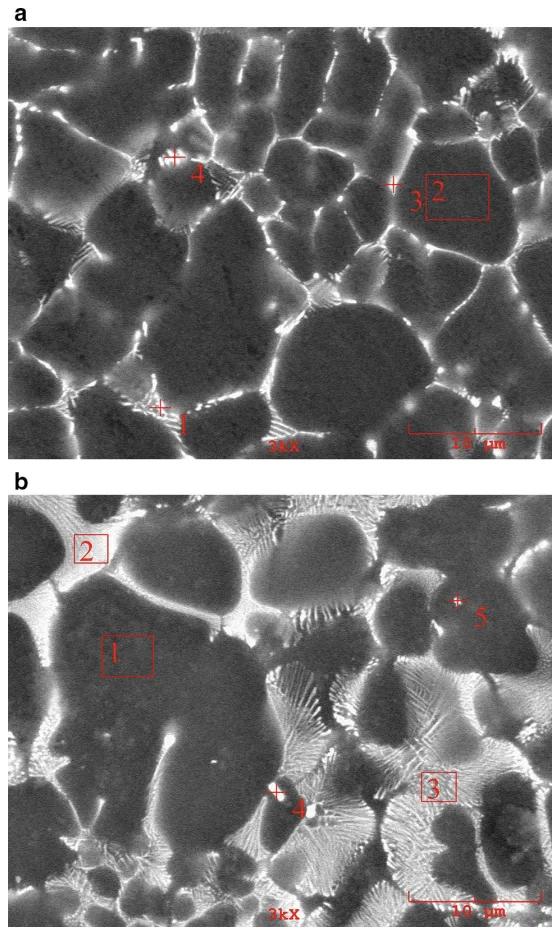 - Fig. 5 SEM image of a Mg5Sn1La, b Mg5Sn2La alloys