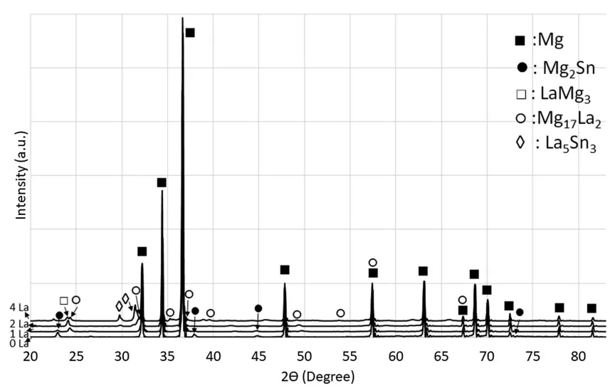 - Mg5Sn合金はα-Mg相とMg2Sn相で構成されていますが、La添加はLaMg3、Mg17La2、La5Sn3相の形成を誘起します。