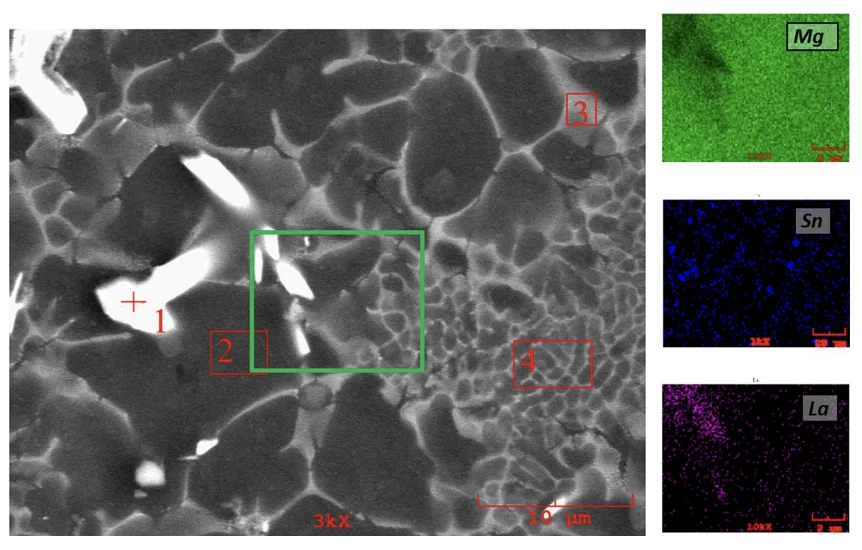- Fig. 7 SEM image of the Mg2Sn4La alloy, and EDS elemental mapping analysis of the area represented with a green rectangle