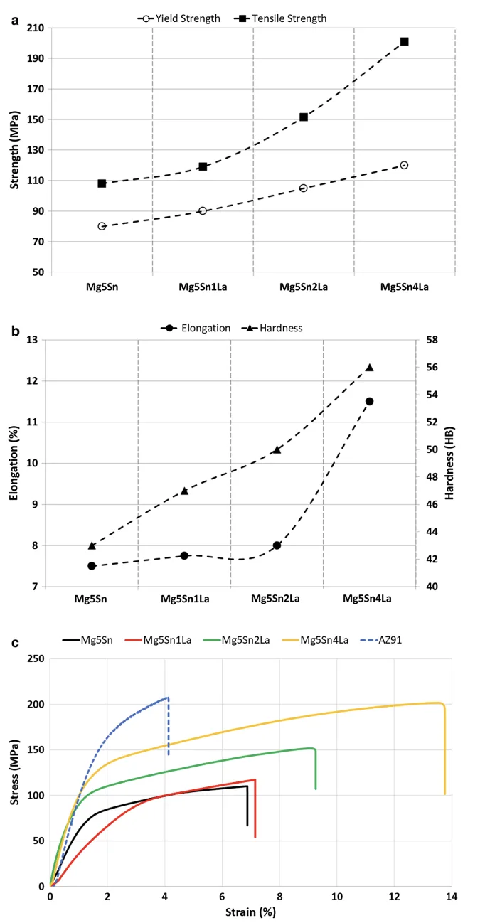 - La添加によって新たに現れた相は、結晶粒径の微細化と分散強化メカニズムを通じて、引張強さ、延性、および硬さを向上させます。Mg5Sn4Laの引張強さはMg5Snと比較して2倍に増加し、降伏強さと延性も大幅に向上しました。