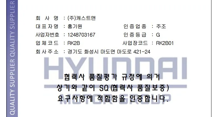 CASTMAN에서는 항상 높은 품질과 고객 만족도가 최우선 입니다. 그렇기 때문에 부품을 개발하는 모든 프로세스는 엄격한 관리를 진행하고 있습니다. 사소한 실수라도 간과해서는 안 됩니다. 저희는 세계적인 자동차 회사인 현대기아자동차그룹이 지원하고, 현대-WIA가 관리하는 품질 인증서인 SQ마크(Suppler Quality Certificate) 인증을 받았습니다. SQ-Mark는 제품에 대한 기술력과 높은 품질 수준을 자동차 회사로부터 인정받을 수 있는 능력을 부여합니다. 제품 품질을 보장하는