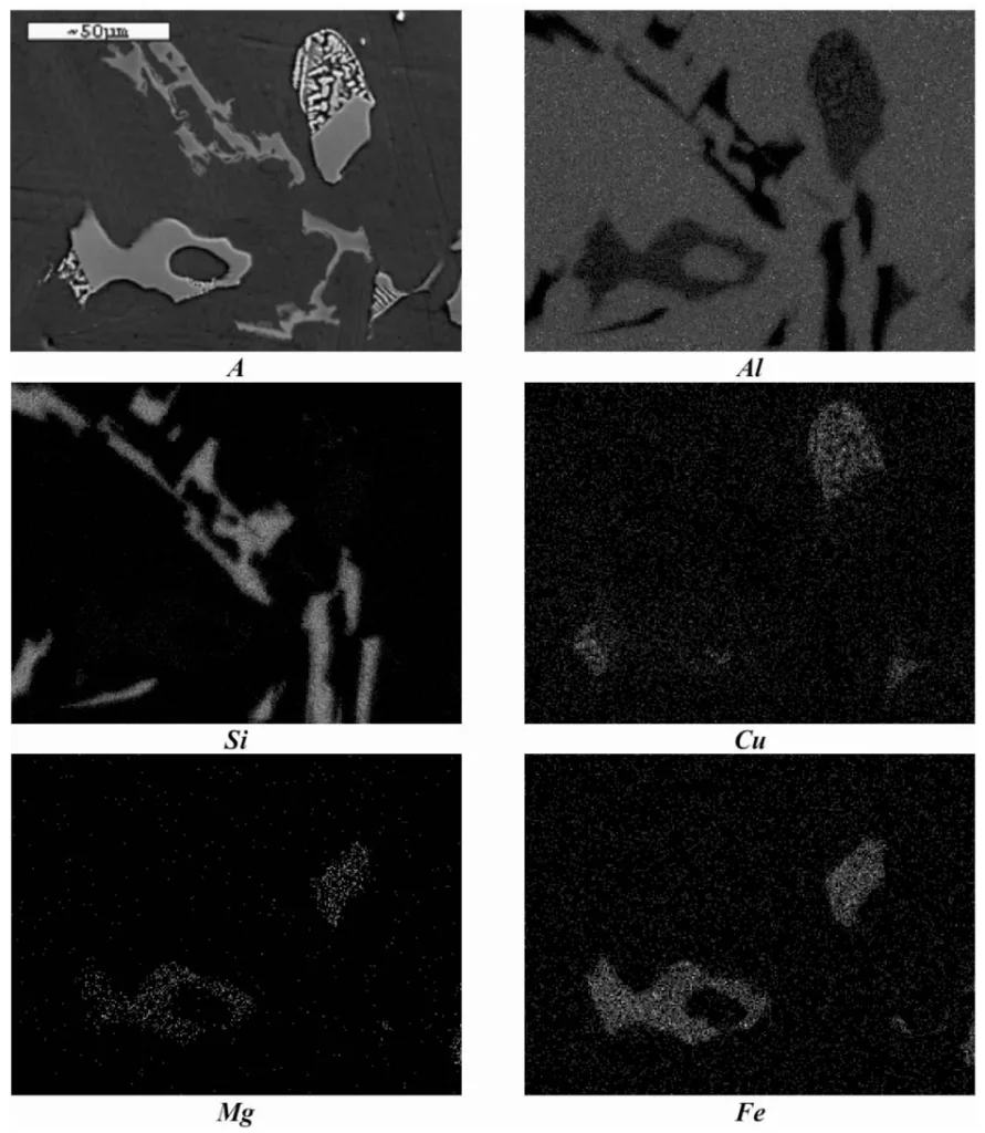 - The microstructure includes needle-shaped precipitations of the Al5FeSi phase, usually near α+Al₂Cu+AlCuMgSi+β eutectics.