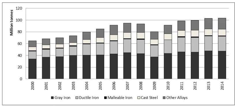 - Global casting production grew by approximately 60% from 64.75 million tonnes in 2000 to 103.64 million tonnes in 2014.